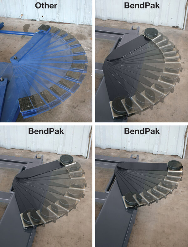 BendPak movable arm safely provides increased range of motion, increased access to wheelbases. Value brand pivots at a fixed position for more limited functionality.